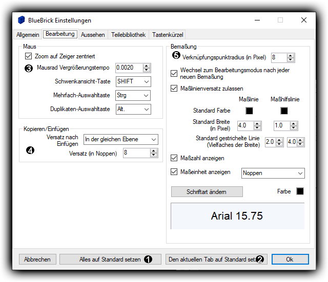Mit der Schaltfläche 1 können Sie alle Einstellungen auf ihre Standardwerte zurücksetzen, wie bei der Erstinstallation von BlueBrick. Mit der Schaltfläche 2 können Sie nur die Einstellungen wiederherstellen, die in der aktuell sichtbaren Kategorie angezeigt werden.